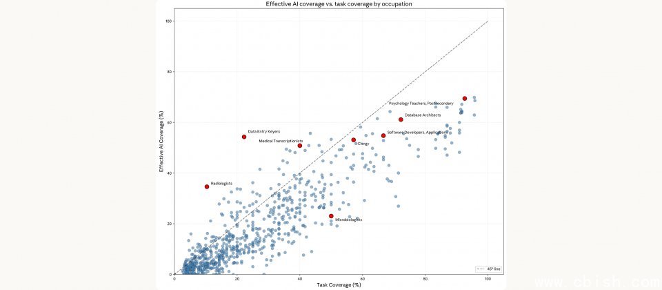职务层级散点图比较Claude.ai数据中的任务覆盖率,与纳入成功率并以工时占比及发生频率加权的有效AI覆盖率,虚线表示两者相等,落在虚线下方则代表仅看任务覆盖率可能高估AI影响