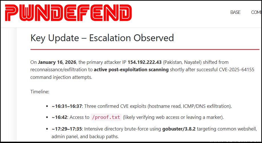 另一家安全公司Pwndefend根据Defused提供的数据判断,攻击者使用了分布式的网络,涉及巴基斯坦、美国、泰国、中国、日本、保加利亚等多个IP地址,先进行侦察与漏洞利用,自1月16日起升级攻击行动,转向目录暴力破解、反向连接尝试、数据外泄及后门植入,并通过扫描指令建立持久化访问通道。目前尚无明确证据指向特定犯罪组织,但上述手法常见于凭证贩卖或勒索软件攻击的前期活动。