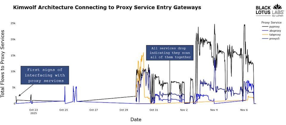 Lumen表示,他们在9月初发现Aisuru后台C2的IP地址65.108.5[.]46,进一步调查发现攻击源自加拿大的固定代理服务器的SSH连接。随后,该公司在10月初发现另一个C2域名,发现黑客先后托管了Aisuru和Kimwolf僵尸网络的ELF可执行文件。在接下来的7天内,Kimwolf控制的被感染设备(机器人)数量增长了三倍,到10月中旬已达80万台,且这些被劫持设备的流量绝大部分通过单一住宅代理服务进行出售。10月20日至11月6日期间,Lumen监测到多个住宅代理服务器出现异常高流量,引起其警觉。