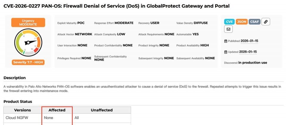 本周,安全公司Palo Alto Networks修复了一个高危拒绝服务(DoS)漏洞,引发多家安全媒体关注。1月15日,Palo Alto Networks发布安全公告,指出其防火墙操作系统PAN-OS中存在高危漏洞CVE-2026-0227,未经身份验证的攻击者可导致防火墙服务中断,若反复触发该漏洞,甚至可能使防火墙进入维护模式。该漏洞CVSS评分高达7.7分,影响PAN-OS及SASE平台Prisma Access用户。该公司已为10.2至12.1版本的PAN-OS,以及10.2与11.2版本的Prisma Access发布补丁。由于暂无其他有效缓解措施,公司强烈建议用户尽快安装更新。