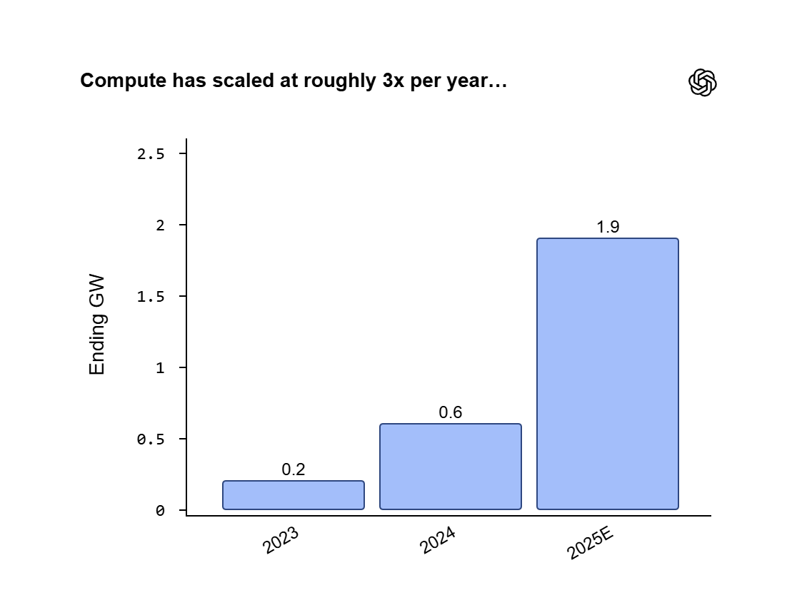 文章中最受关注的是,Friar首次公开了OpenAI近三年的算力与营收数据。她指出,OpenAI可用算力从2023年的0.2GW增长至2024年的0.6GW,并于2025年达到约1.9GW;同期年化经常性收入从2023年的20亿美元,增长至2024年的60亿美元,并在2025年突破200亿美元。Friar表示,营收的增长曲线与算力扩张同步,若能获得更多算力,客户采用与变现速度将更快。