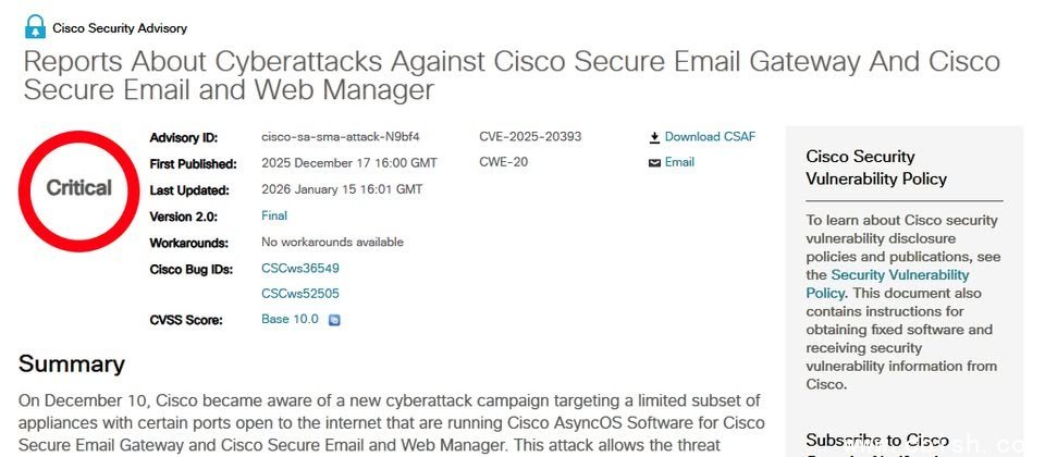 1月15日,思科更新了公告内容,为邮件网关设备SEG发布了15.0.5-016、15.5.4-012和16.0.4-016版本的AsyncOS更新,同时为邮件和网页安全网关SEWM发布了15.0.2-007、15.5.4-007和16.0.4-010版本的AsyncOS更新,以修补CVE-2025-20393漏洞。