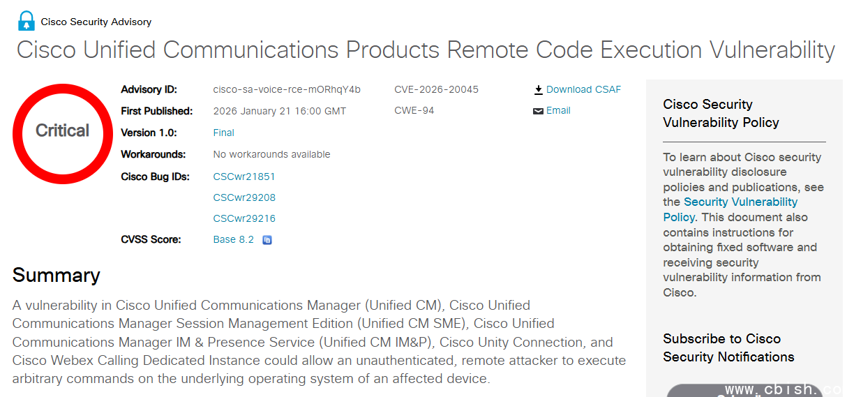 该漏洞影响的产品包括:统一通信管理(Unified CM)、统一通信管理会话管理版(SME)、统一通信管理即时消息与存在服务(Unified CM IM&P)、Unity Connection以及Webex Calling专用实例。