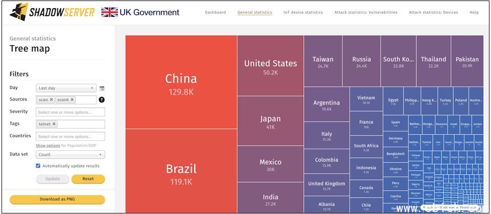根据详细统计,受影响服务器数量最多的国家和地区为中国(13万台)、巴西(12万台)和美国(5万台),中国大陆地区也有超过2.4万台Telnet服务器存在该风险。