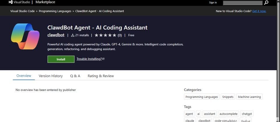 该扩展的完整名称为“ClawdBot Agent – AI Coding Assistant”,显然是攻击者刻意模仿热门开源AI代理项目的名称,以降低开发者的警惕性。值得注意的是,该扩展在安装后确实具备攻击者宣称的AI辅助编码功能,外观和行为与正规AI代码助手无异,更容易获取用户信任。