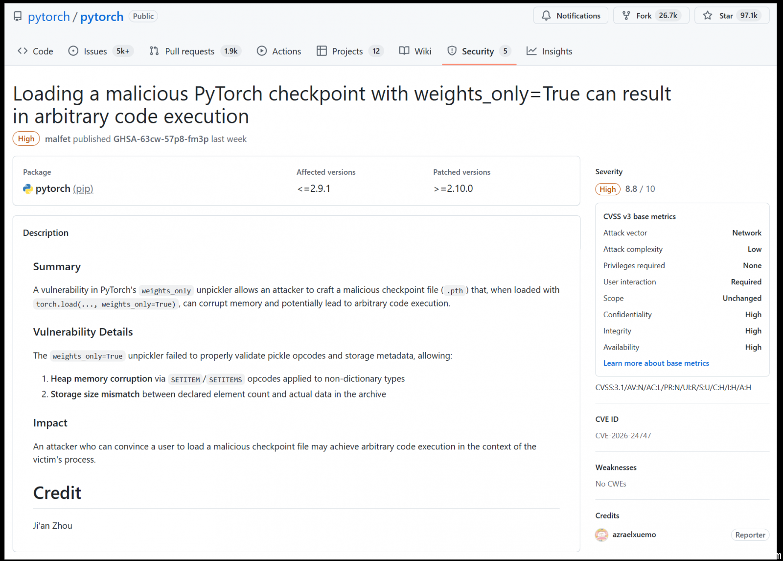 开源深度学习框架PyTorch被披露存在安全漏洞CVE-2026-24747,CVSS风险评分为8.8分,属于高风险(High)等级。即使用户启用了原本用于降低风险的安全加载选项,攻击者仍可能通过特制的模型文件触发远程代码执行(RCE)。