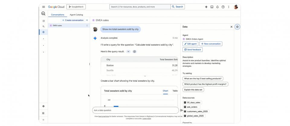 Google 在 BigQuery 中推出对话式分析预览版,用户可在 BigQuery Studio 中使用自然语言提问,系统将自动生成并执行 SQL,返回解读、查询结果与图表。Google 表示,该功能可缩短用户等待数据团队响应的时间,使提问到获取答案的流程更加直接。