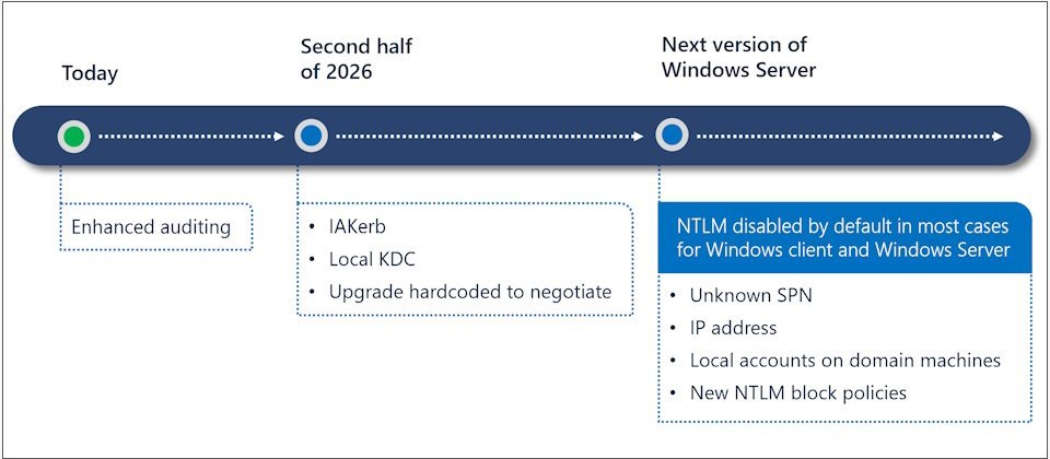 第二阶段(2026年年中至下一版Windows Server发布前):微软将逐步关闭NTLM功能,并于2024年下半年为Windows 11 24H2及Server 2025以上版本推出配套工具,协助停用NTLM,包括IAKerb、本地KDC(密钥分发中心)升级,以及将核心Windows组件中硬编码的NTLM逻辑升级为自动协商Kerberos。