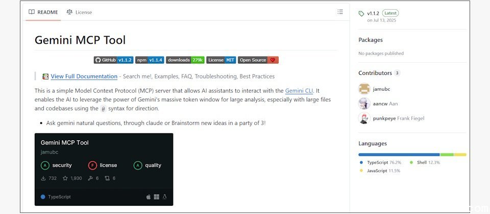 Gemini MCP Tool的设计目的是让AI助手通过MCP服务器与Gemini命令行工具Gemini CLI交互,以支持大文件和代码库分析等应用场景。该工具由第三方社区维护,属于非官方项目,并以MIT许可证发布。