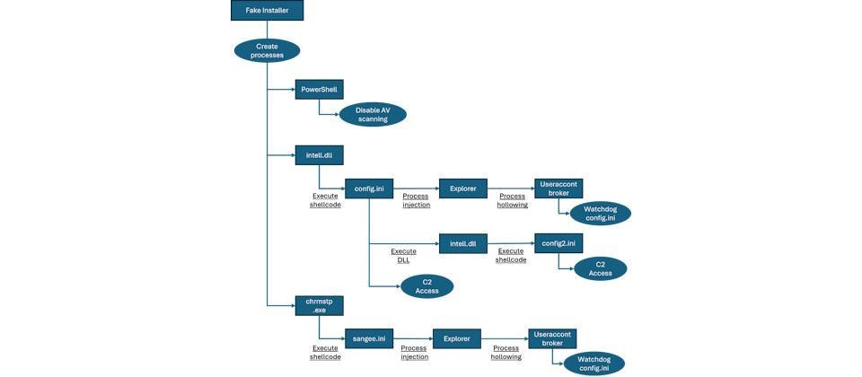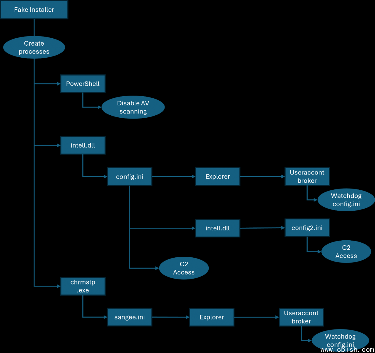 其中,PowerShell用于执行一组规避Windows内置杀毒软件检测的命令,将系统大部分磁盘加入Microsoft Defender的排除扫描列表;rundll32.exe用于加载恶意DLL文件intel.dll,该文件会读取名为config.ini与config2.ini的Shellcode,并从C2服务器下载二进制文件并执行;第三个文件chrmstp.exe的行为与intel.dll类似,它从另一个文件Sangee.ini加载Shellcode,这些工具最终在受害电脑上植入ValleyRAT。