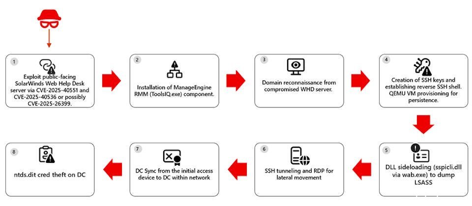 微软较早前已预警此类多阶段攻击活动:攻击者首先通过WHD获取初始访问权限,随后横向移动至网络中其他高价值资产。由于SolarWinds于1月28日披露并修复了远程代码执行漏洞CVE-2025-40551,且该漏洞可与另一个绕过安全控制的漏洞CVE-2025-40536结合利用,引发广泛担忧。但微软指出,此次攻击活动始于去年12月,且受影响的WHD版本不一,尚无法确认攻击者具体利用了哪个漏洞,不排除去年9月修复的CVE-2025-26399也被滥用。