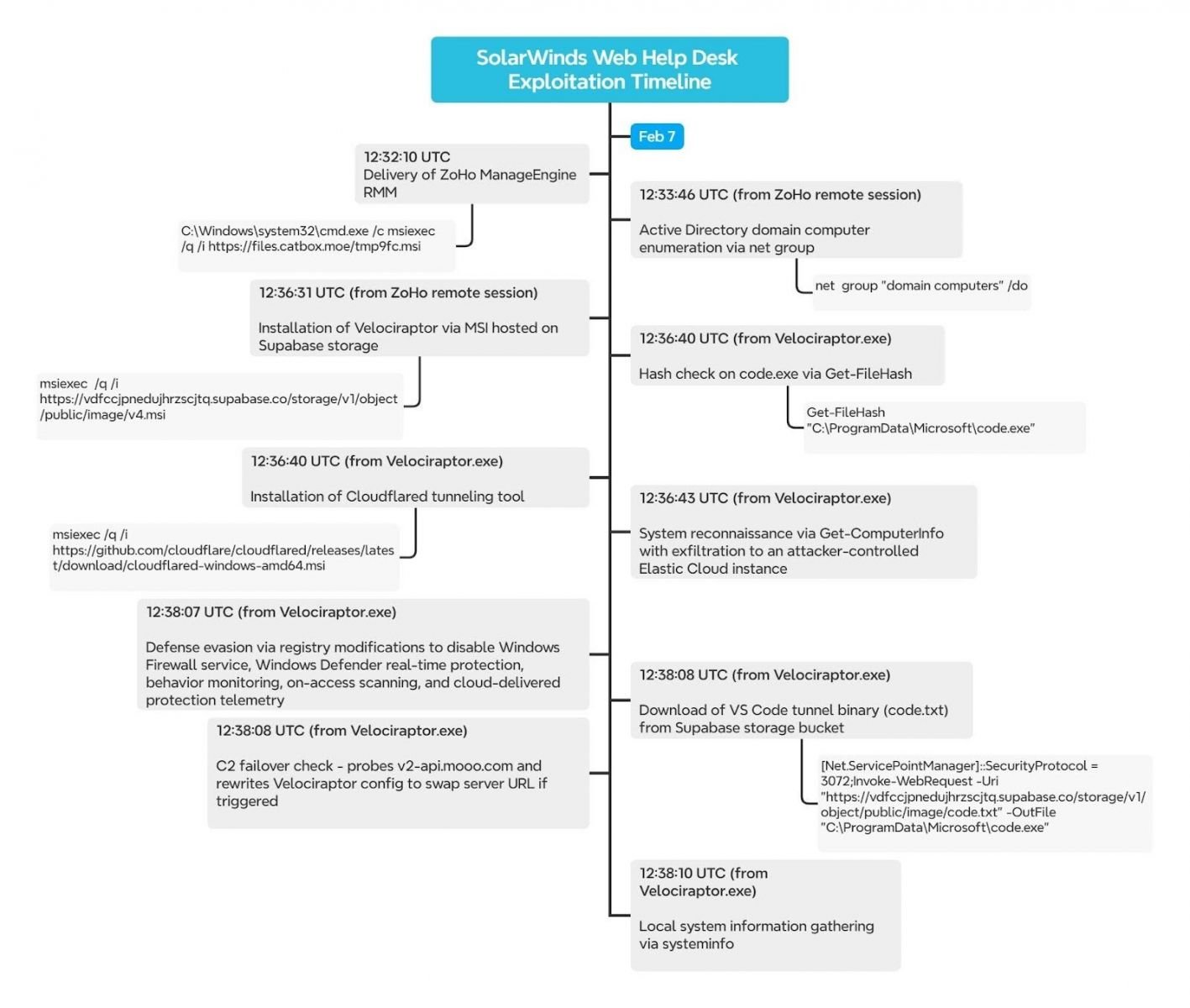微软与威胁情报公司Huntress发出警告,发现攻击者针对SolarWinds的网络IT服务台Web Help Desk(WHD)展开行动,通过部署Zoho ManageEngine的远程管理工具(RMM)建立持久访问通道,最终在受感染主机上植入数字取证与事件响应(DFIR)工具Velociraptor。