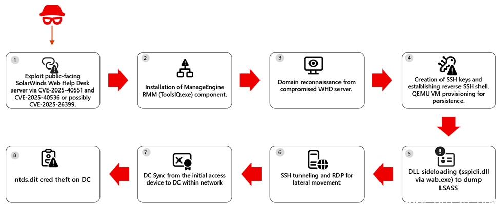 微软较早前已预警此类多阶段攻击活动:攻击者首先通过WHD获取初始访问权限,随后横向移动至网络中其他高价值资产。由于SolarWinds于1月28日披露并修复了远程代码执行漏洞CVE-2025-40551,且该漏洞可与另一个绕过安全控制的漏洞CVE-2025-40536结合利用,引发广泛担忧。但微软指出,此次攻击活动始于去年12月,且受影响的WHD版本不一,尚无法确认攻击者具体利用了哪个漏洞,不排除去年9月修复的CVE-2025-26399也被滥用。