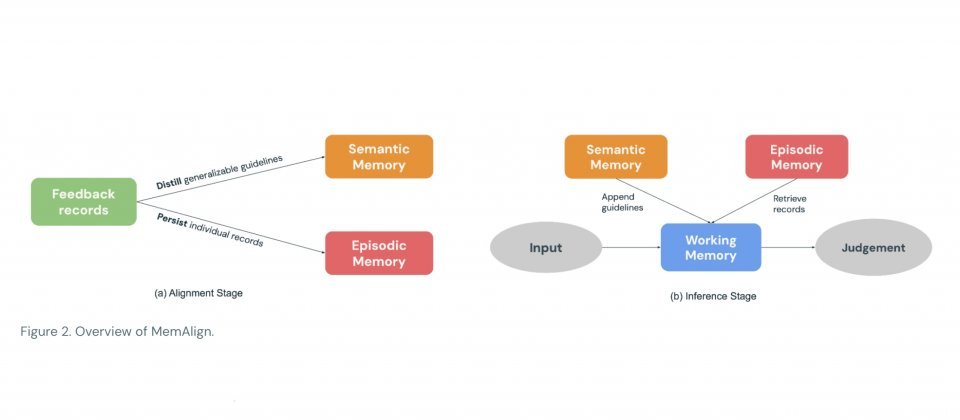 MemAlign采用双记忆架构,无需更新模型权重。系统会将专家以自然语言撰写的反馈提炼为可复用的评估原则,存入语义记忆;同时将难以用原则完整覆盖、且容易出错的具体案例保留在情景记忆中。当新输入到来时,MemAlign会先整合既有原则,并从情景记忆中检索相似案例,共同组成工作记忆作为本次评估的参考上下文,再交由LLM完成评分。记忆内容支持删除或覆盖,便于应对规定变更、需求调整或数据清理等场景。