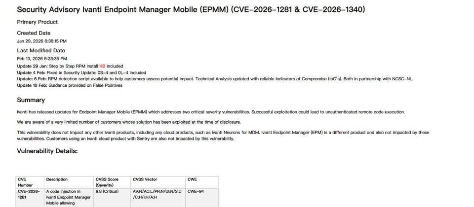 1月29日,安全与IT管理解决方案公司Ivanti发布安全公告,指出其移动设备管理(MDM)平台Endpoint Manager Mobile(EPMM)存在代码注入漏洞,漏洞编号为CVE-2026-1281与CVE-2026-1340,并透露已有部分用户遭受漏洞利用攻击。值得注意的是,后续传出荷兰政府机构、欧盟委员会以及芬兰政府IT服务供应商受到影响,有安全媒体援引专家观点称,这是一起由单一黑客组织针对特定目标实施的精准攻击。