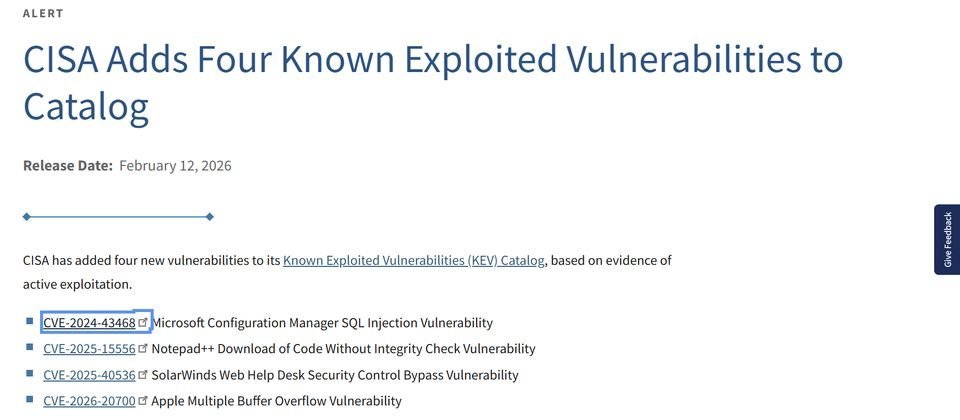 除CVE-2024-43468外,CISA还将另外三个漏洞列入“已知被利用漏洞”(Known Exploited Vulnerabilities,KEV)清单,包括中国黑客用于攻击东亚多国的Notepad++漏洞CVE-2025-15556、SolarWinds Web Help Desk漏洞CVE-2025-40536,以及被用于针对特定高风险个人的苹果iOS/iPadOS/watchOS/tvOS/visionOS 26.3漏洞CVE-2026-20700。