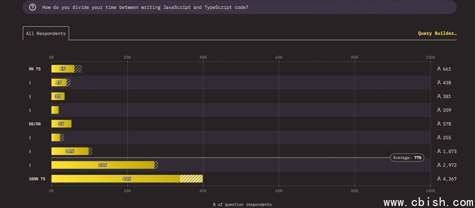 使用统计呈现出开发者的日常使用情况,受访者平均有77%的时间花在编写TypeScript,代表许多团队已将类型化开发视为默认选项,而针对浏览器的JavaScript代码平均有86%会经过构建步骤(下图)。由于TypeScript等类型化代码通常需要在构建阶段进行类型剥离与转译,类型化开发与构建流程高度绑定,也因此影响了开发者对构建工具的选择。