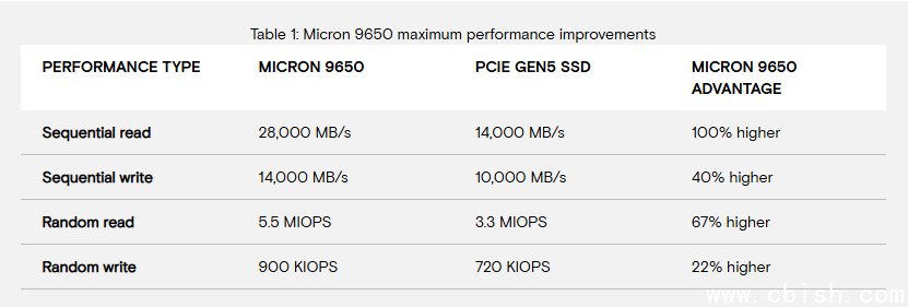 根据美光公布的数据,Micron 9650最高顺序读取速度为28,000MB/s,顺序写入为14,000MB/s;随机读取可达550万IOPS,随机写入为90万IOPS。相较PCIe 5.0产品,读取性能提升100%,写入提升40%,随机读取与写入则分别提升67%与22%。