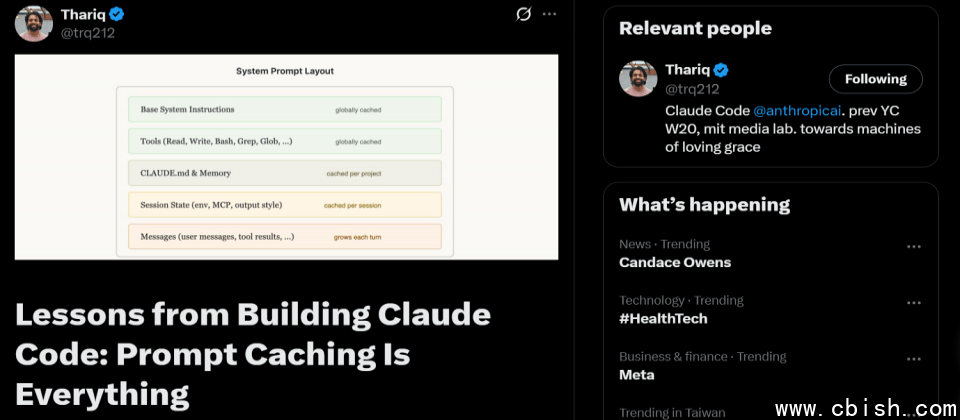 Claude Code核心工程师Thariq Shihipar最近分享了五大心法,说明他们如何通过提示词缓存(Prompt Caching)优化系统性能,同时降低成本。他甚至透露,Claude Code团队非常重视提示词缓存,不仅持续监控,一旦发现缓存命中率下降,就会将其视为紧急系统事故(SEV)处理。