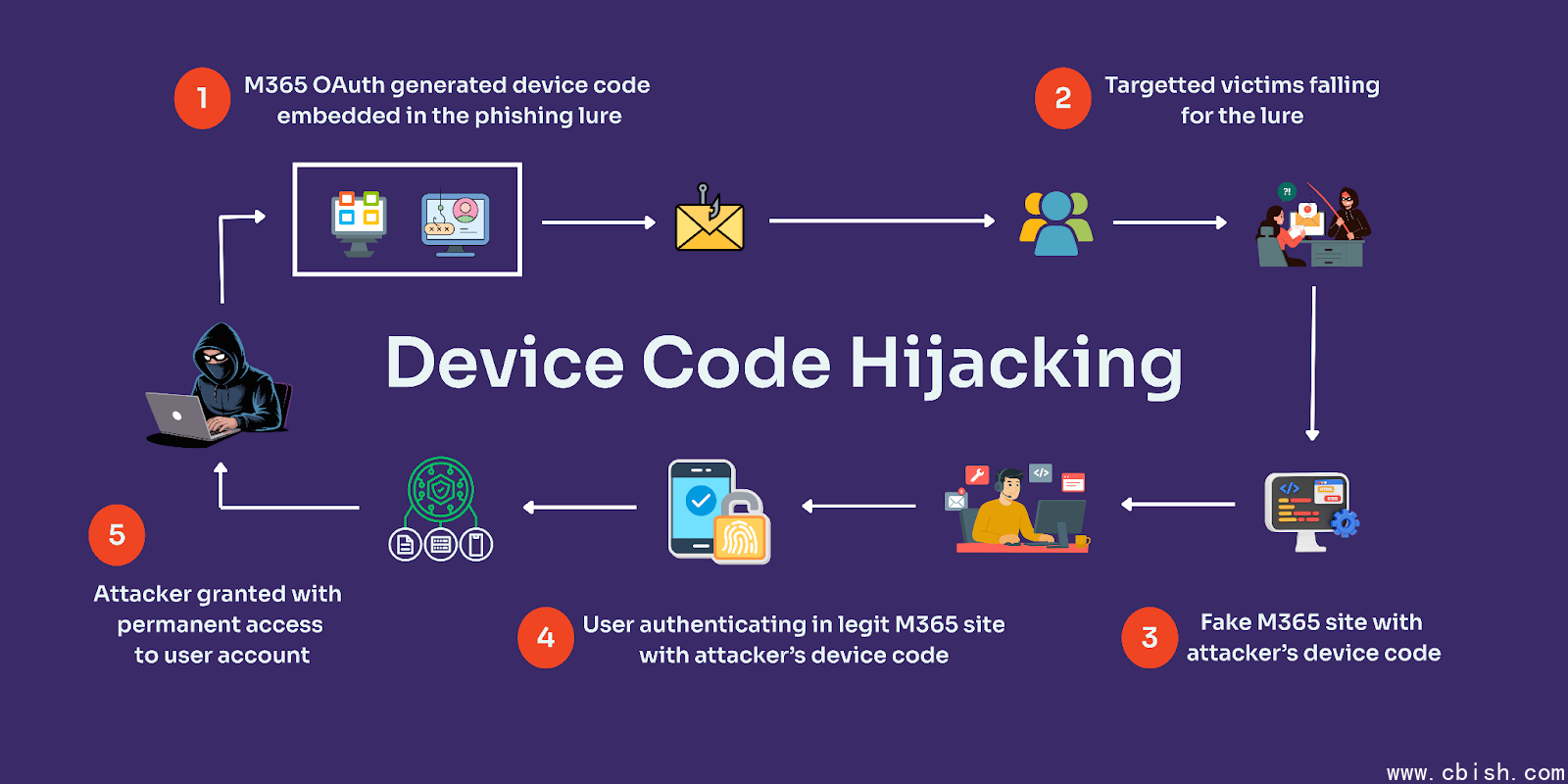 在这波攻击中,攻击者利用微软标准登录页面和正规的设备验证流程,通过语音钓鱼入侵企业员工的Entra账户,从而访问受害者可用的资源和单点登录应用。Bleeping Computer指出,微软身份验证平台提供“设备授权许可”(Device Authorization Grant)机制,初衷是方便用户连接物联网设备、打印机、流媒体设备和智能电视。Entra会在这些设备上显示一个验证码,要求用户在电脑或手机浏览器中输入该码,完成流程后,设备即可自动绑定用户账户。而黑客正是利用这一机制实施攻击。