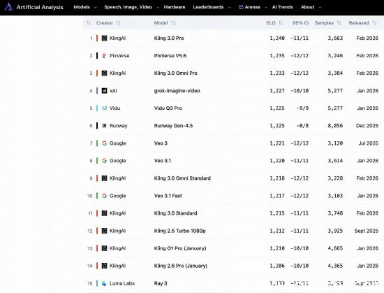 近日,全球权威AI测评机构Artificial Analysis发布了2026年最新视频大模型榜单,在文生视频(Text-to-Video)赛道中,由中国团队研发的可灵3.0 Pro(Kling3.0Pro)以1240分的高分强势登顶,超越OpenAI的Sora、Runway Gen-3、Stability AI的Stable Video等国际主流模型,成为全球首个在综合评分中突破1200分的视频生成模型。