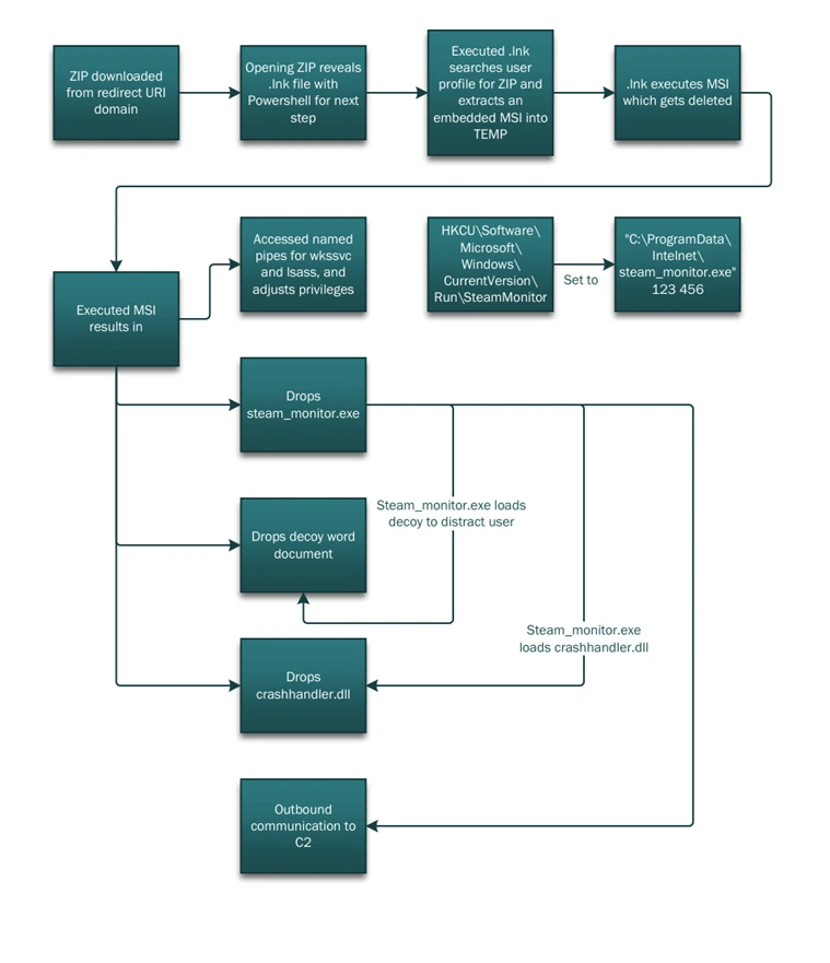 若攻击得逞,受害者通常会被导向EvilProxy或其他网络钓鱼框架,攻击者通过中间人攻击截获用户的凭证或会话Cookie。此外,部分用户在跳转后,电脑会自动下载ZIP文件,其中包含LNK文件和HTML走私工具。若用户按指示解压并执行指定文件,可能导致PowerShell执行、DLL侧载恶意程序,甚至键盘劫持或勒索软件感染。