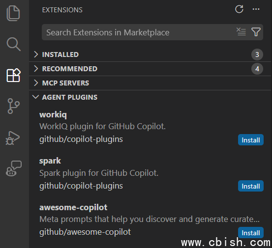 微软在本版本中引入代理插件机制,开发者可通过扩展市场安装包含技能、命令、代理和 Hook 等组件的完整代理包。插件可在扩展视图中搜索并安装,VS Code 默认从 GitHub 仓库获取插件来源,也支持开发者指定其他远程仓库或本地目录。