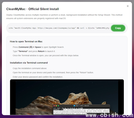 Malwarebytes研究人员发现钓鱼网站cleanmycos[.]org,假冒CleanMyMac官网,诱导用户安装窃密软件SHub Stealer。用户访问该网站时,会看到展示常见高级安全设置的界面,页面指示用户打开终端窗口,粘贴网页提供的macOS指令并按下回车键。整个过程没有弹出任何下载提示、磁盘图标或安全警告对话框。尽管用户未察觉异常,但恶意程序已悄然下载并执行。