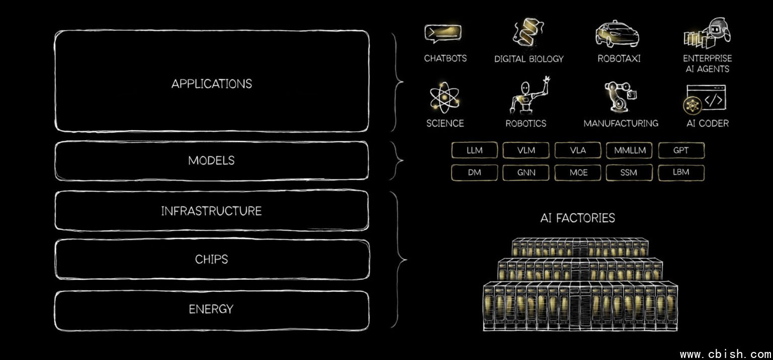 Nvidia执行长黄仁勋最近抛出一个让人耳目一新的隐喻:AI是一座拔地而起的“五层蛋糕”架构。从第一性原理出发,黄仁勋指出,计算机运算世界正经历根本性的转变,从过去“预设好的软件”进化到“实时生成的智能”。