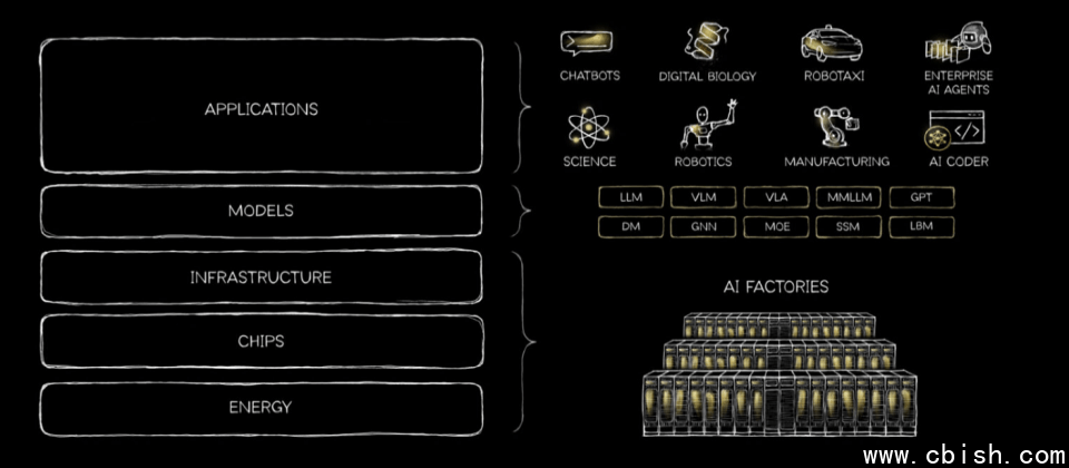 芯片(Chips):在能源层之上,任务是高效地将电力转化为算力。这不只是GPU的竞争,更是高带宽内存(HBM)与高速互连技术的总和,决定了“智能成本”能降多少。