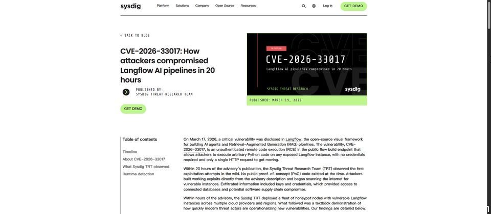 安全公司Sysdig指出,在Langflow于3月17日协调世界时(UTC)晚间8时发布安全公告后,他们于18日下午4时04分检测到第一波漏洞利用尝试,不到一分钟内,另一组攻击者随即加入,随后更多不同来源的终端节点开始扫描该漏洞。换言之,漏洞公布约20小时后,便已被用于实际攻击。Sysdig强调,当时并未公开任何可直接使用的概念验证(PoC)代码,这些攻击者仅依据安全公告的内容,自行构建漏洞利用流程,并主动寻找尚未修补的Langflow主机。