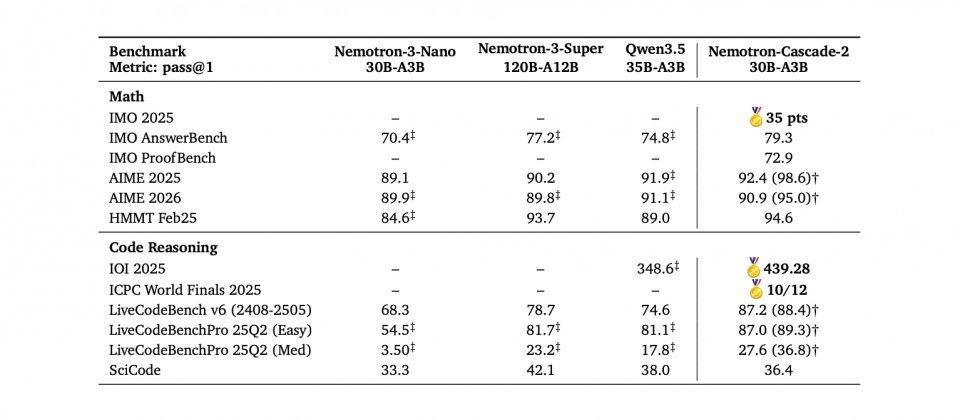Nemotron-Cascade 2采用较小的激活参数规模,但在推理任务中展现出更高的性能密度。根据论文披露的评估结果,该模型在IMO 2025中获得35/42分,在IOI 2025中取得439.28/600分,并在ICPC世界总决赛2025中解答了10/12道题目。研究团队指出,Nemotron-Cascade 2在IMO 2025、IOI 2025与ICPC世界总决赛2025的解题评估中已达到金牌水平,并将其列为代表性成果。需注意的是,这些分数来自论文中的模拟评估,并非模型实际参与正式竞赛所得。