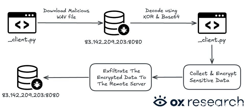 值得注意的是,本次攻击同时针对Windows、macOS和Linux三大操作系统。被篡改的telnyx/_client.py文件在加载时会自动执行,根据操作系统启动对应的攻击链:在Windows系统中,攻击者会下载并释放恶意可执行文件,伪装成msbuild.exe并写入启动文件夹,以实现持久化驻留;在Linux和macOS系统中,攻击者则会下载隐藏在WAV音频文件中的数据窃取程序。