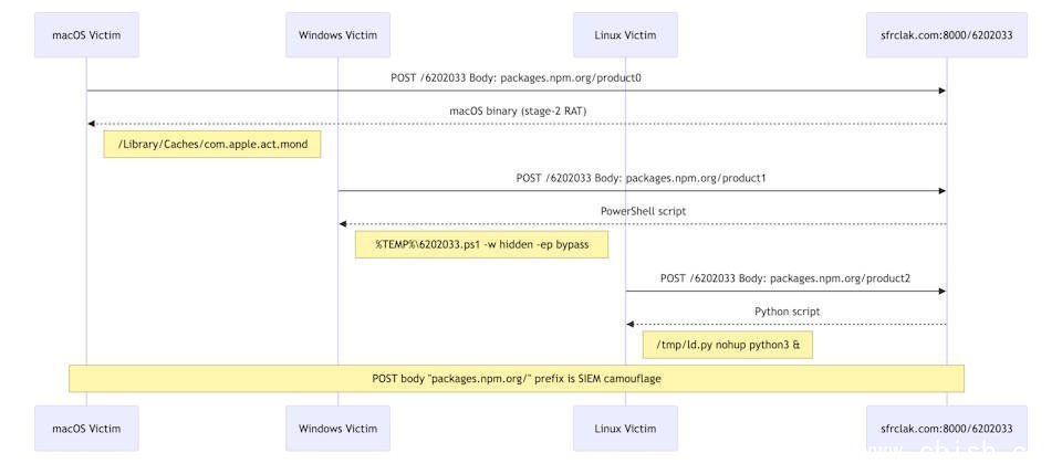 针对此次攻击过程,攻击者先于3月30日发布了一个看似正常的依赖包plain-crypto-js,以此绕过NPM的审查机制,随后上传含恶意代码的新版本,并在短时间内同步污染了Axios的两个主要版本分支1.x与0.x。Elastic指出,攻击者针对三大操作系统的有效载荷均为同一款RAT木马的不同实现,其C2通信协议、指令集、Beacon通信频率以及伪造的用户代理字符串(User Agent)完全一致,区别仅在于Windows、macOS和Linux版本分别使用PowerShell、C++和Python编写。
