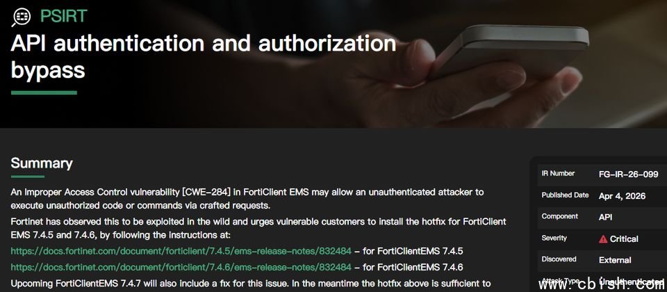 4月4日,安全公司Fortinet发布通告,指出其终端管理平台FortiClient EMS存在安全漏洞CVE-2026-35616。未经身份验证的攻击者可利用特制请求,在受影响的7.4.5至7.4.6版本中执行未经授权的代码或命令。该漏洞CVSS评分为9.1分(满分10分),属高危等级。Fortinet表示,已掌握该漏洞被实际利用的证据,并在即将发布的7.4.7版本推出前,为7.4.5与7.4.6版本用户提供热修复补丁,呼吁用户尽快按指引安装。