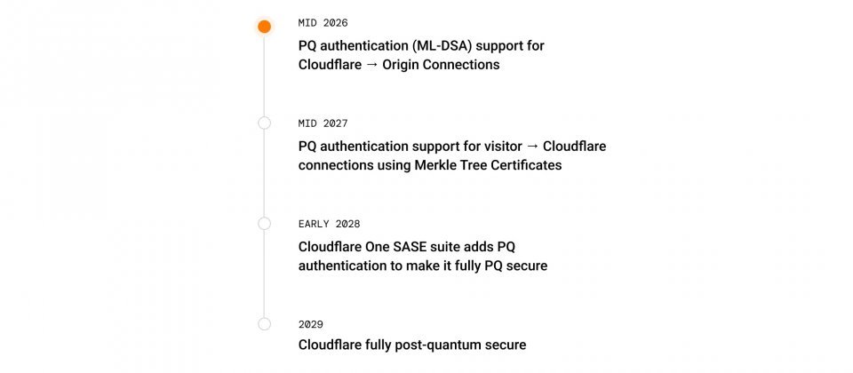 Cloudflare公布的实施计划分为四个阶段:2026年中支持Cloudflare到源服务器连接的后量子身份认证(ML-DSA);2027年中通过Merkle树证书支持访客到Cloudflare连接的后量子身份认证;2028年初,Cloudflare One SASE套件全面集成后量子身份认证;2029年实现全面后量子安全。Cloudflare承诺,所有后量子升级将免费提供给所有用户。