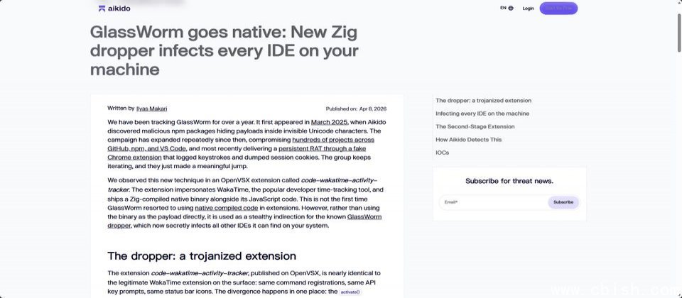 安全公司Aikido在Open VSX发现恶意扩展code-wakatime-activity-tracker,黑客模仿热门的时间追踪工具WakaTime,并在扩展中嵌入用Zig语言编译的二进制文件。与此前攻击行动类似,该二进制文件并非GlassWorm的实际载荷,而是用于传播该蠕虫的中间工具。此次GlassWorm的感染目标,是受感染电脑上安装的所有IDE工具。