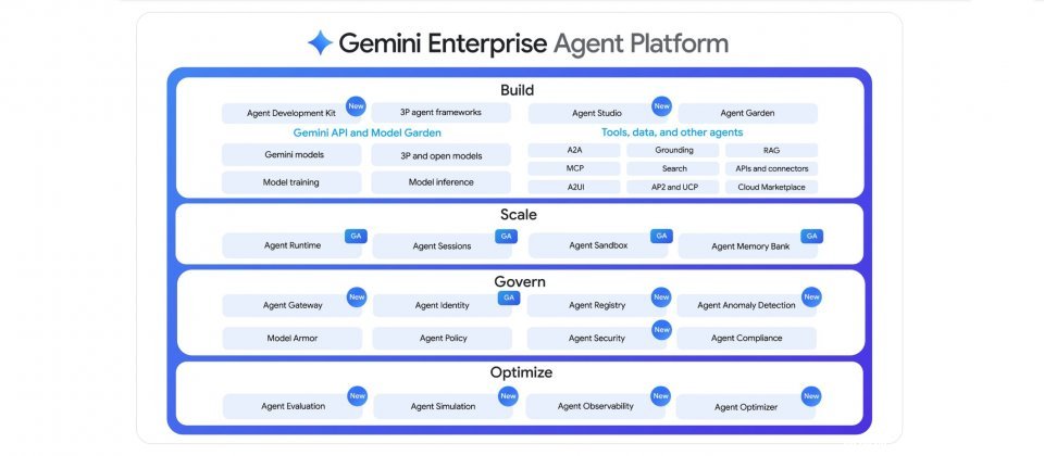 Google在Cloud Next 2026上发布了Gemini企业代理平台,这是一个基于Vertex AI构建的新一代企业级AI代理平台。Vertex AI服务及其后续更新将全部通过该代理平台交付,不再以独立服务形式提供。新平台从构建、扩展、治理到优化四个维度,全面覆盖企业级AI代理的完整生命周期。