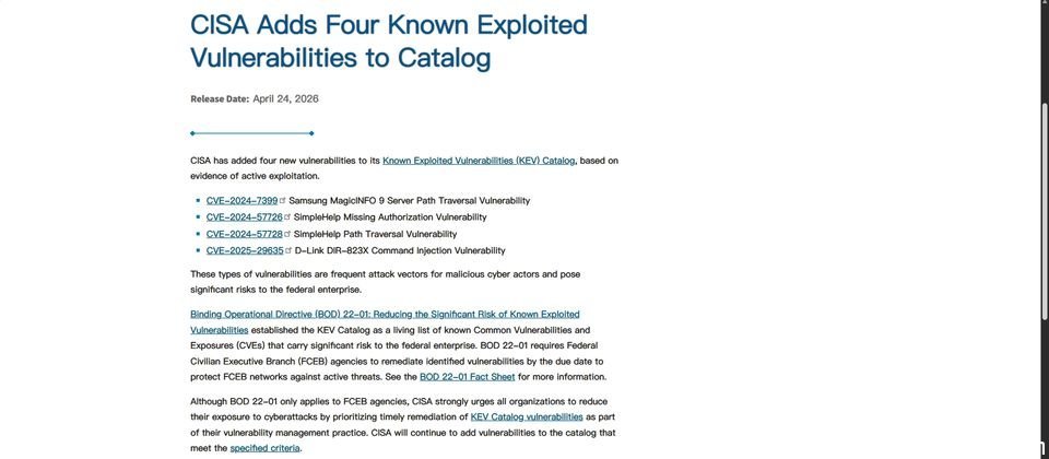 同日被列入KEV清单的其他漏洞还包括远程管理与监控工具SimpleHelp的权限缺失漏洞CVE-2024-57726、路径遍历漏洞CVE-2024-57728,以及三星MagicINFO 9 Server的路径遍历漏洞CVE-2024-7399。