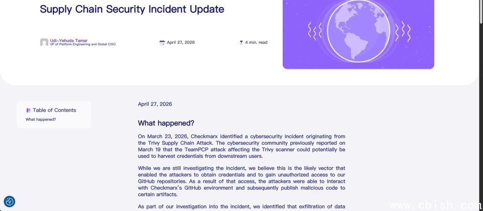 次日,Checkmarx进一步说明,此次事件源于Trivy供应链攻击。该公司分析认为,攻击者利用此次攻击获取了凭证,从而未经授权访问了其GitHub仓库,并上传了恶意代码。Checkmarx确认数据泄露发生于3月30日,4月25日,黑客组织Lapsus$将数据公布在暗网。公司已公开事件全过程,并公布后续应对措施。