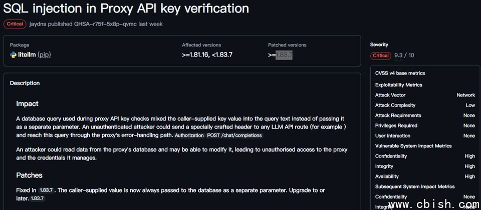 一旦利用成功,攻击者即可读取甚至篡改代理服务器数据库中的数据,导致未经授权访问代理服务器及其管理的凭证。该漏洞CVSS v4.0风险评分为9.3分,属于高危级别。开发团队已发布LiteLLM 1.83.7版本进行修复。