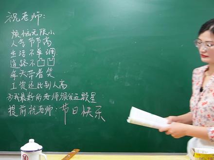 这又写的啥 谢谢同学们的祝福 我认为呢 送的话要送什么礼而为难 中国自古是“礼仪之邦” 因此适当的礼仪还是需要的 每逢教师节 老师会不会区别对待 那教师节到底要不要给老师送礼呢 或者说呢 你不用拿着这些东西去惯着他们 还有的家长讲话了 所以呢我想表示一下支持 这种呢建议给孩子 擅长手工的同学呢 可以录一段影像,等等 因为送给老师的时候 这是一份心意 我劝有这些想法的家长 心里真的是特别的欣慰和开心 当然了家长也别闲着啊 那如果家里实在是有矿的 一心就想送的 也可以买本书送给老师 老师最想要的到底是什么 说老师真的是挺辛苦的 尊重和理解 所以最好的礼物 就是让孩子赶紧好好学习 为我最好的老师 为我最好的老师 提前祝老师:节 为我最好的老师颁发五颗星 工资还比别人高 每天带着笑 道路不凸凹 生活不单调 人气节节高 烦恼无限小 为我最好的老师