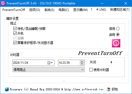 PreventTurnOff 就是为了解决这个痛点而生。它不依赖复杂的注册表修改,也不需要安装臃肿的后台服务,只需一键启动,即可临时冻结系统的睡眠、休眠和自动关机设置,确保你的任务安全运行到底。
